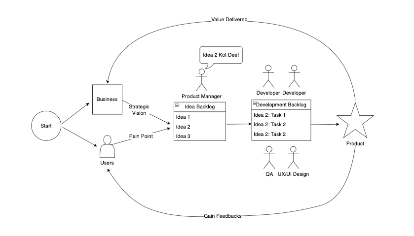เมื่อได้ไอเดียที่ Product Manager เลือกแล้ว ก็จะเอาเข้าไปสู่ Developement Backlog หรือเรียกว่าเป็นแตก Task เพื่อให้ทีมได้สร้าง Product ขึ้นมา