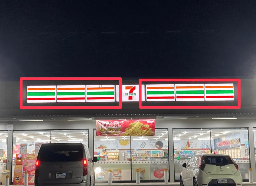 ใครมองรูปด้านบนก็คงคิดว่าปกติ แต่ให้สังเกตตรงป้ายไฟด้านบนที่มีไฟด้านข้างโลโก้เซเว่น จะมีบล็อคฝั่งละ 3 บล็อค