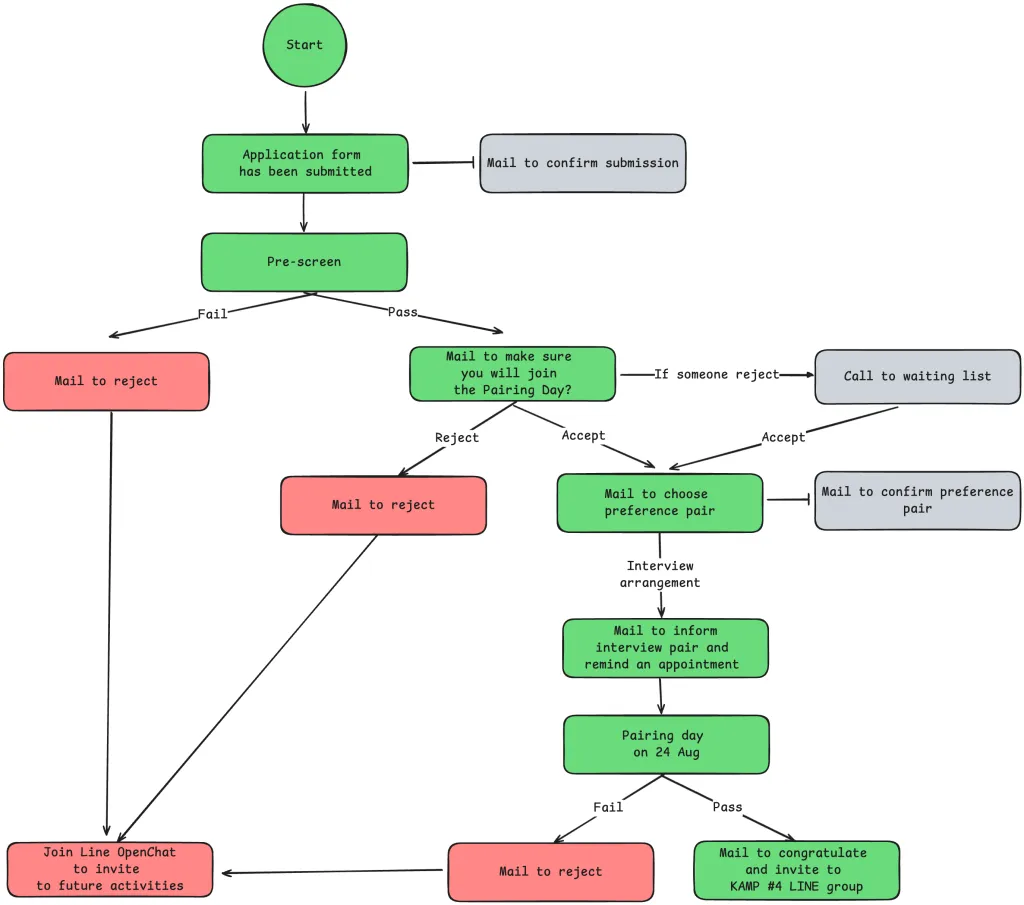 เริ่มจากผู้สมัครกรอกใบสมัครเข้ามาผ่าน Google Fom จากนั้นจะเข้าสู่รอบ Pre-screen จะมีทีมงานที่อ่านใบสมัครและให้คะแนน เพื่อคัดเข้าสู่รอบ Pairing Day (การสัมภาษณ์ On-site โดย Mentor)