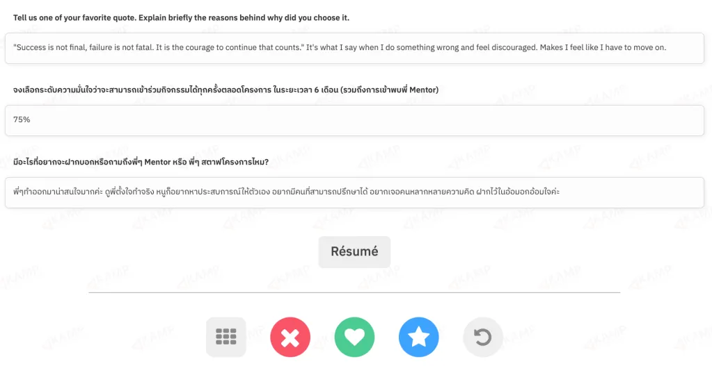 เมื่อกดเข้าไปที่การ์ดแต่ละใบ ก็จะแสดงใบสมัครของน้องคนนั้นๆ ขึ้นมา เมื่ออ่านใบสมัครเสร็จแล้วก็สามารถให้คะแนนได้ที่ปุ่มด้านล่าง