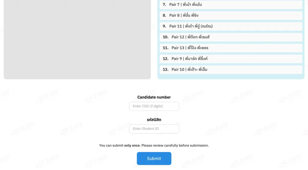 เมื่อน้องเข้ามาที่เว็บก็จะได้เรียงลำดับ Pair ที่ต้องการสัมภาษณ์จากมากที่สุดไปน้อยที่สุด กรอก Candidate number และ รหัสนิสิต เพื่อเป็นการยืนยันตัวตนก่อนที่จะสามารถกด Submit ได้