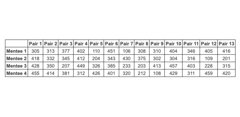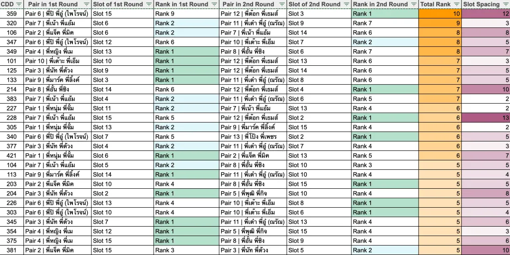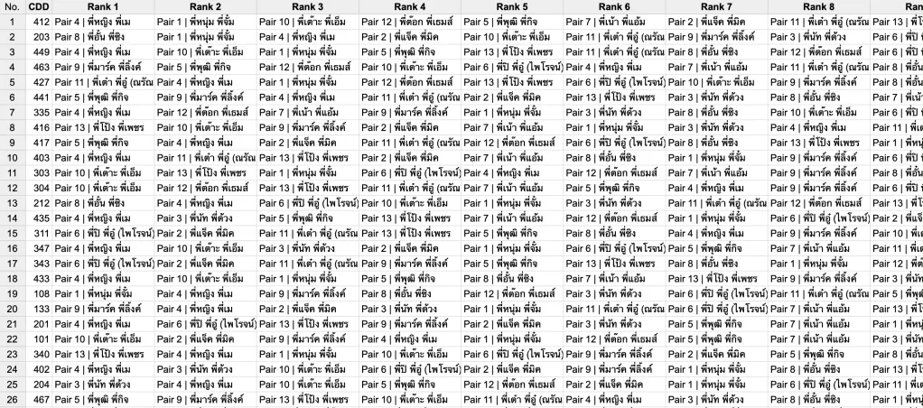 เมื่อเราได้ข้อมูลการเลือก Pair ที่น้องต้องการสัมภาษณ์มาในรูปแบบ Ranking แล้ว เราก็ต้องมาจัดการว่าใครจะได้สัมภาณ์ Pair ไหนบ้าง หน้าตาข้อมูลเป็นประมาณนี้