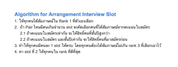 น้องทุกคนจะต้องได้เข้าสัมภาษณ์ใน Pair ที่ต้องการเข้าร่วมมากที่สุดเท่าที่จะเป็นไปได้ อ้างอิงจากข้อมูลการจัด Ranking ของแต่ละคน