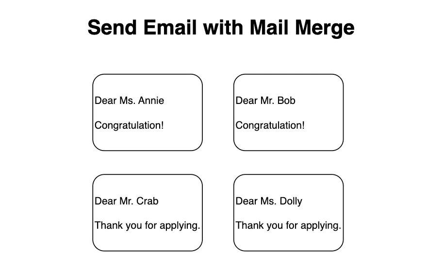 ส่วนคนที่ไม่ผ่านเข้ารอบ ก็จะส่งเมลไปแจ้งเขา ซึ่งเป็นการส่งเมลโดย Custom ให้เมลฉบับนั้นเขียนเป็นชื่อของเขาก็จะทำให้ดูเป็น Professional มากขึ้น วิธีการคือใช้เครื่องมือที่ชื่อว่า “Mail Merge” ดูเพิ่มเติม