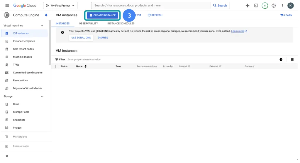 3. เลือก Create Instance โดยใน GCP จะเรียกคอมพิวเตอร์ 1 เครื่องว่า 1 Instance