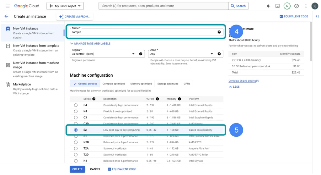 4. ตั้งชื่อตามใจเราได้เลย จากนั้นเลือก Machine เป็น E2 เพราะราคาถูกที่สุด เหมาะสำหรับการทดลองใช้