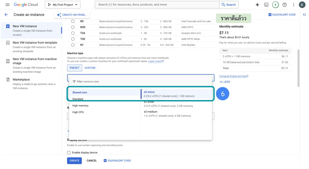 5. เลือก Machine Type เป็น e2-micro เพราะราคาถูกสุดเช่นกัน