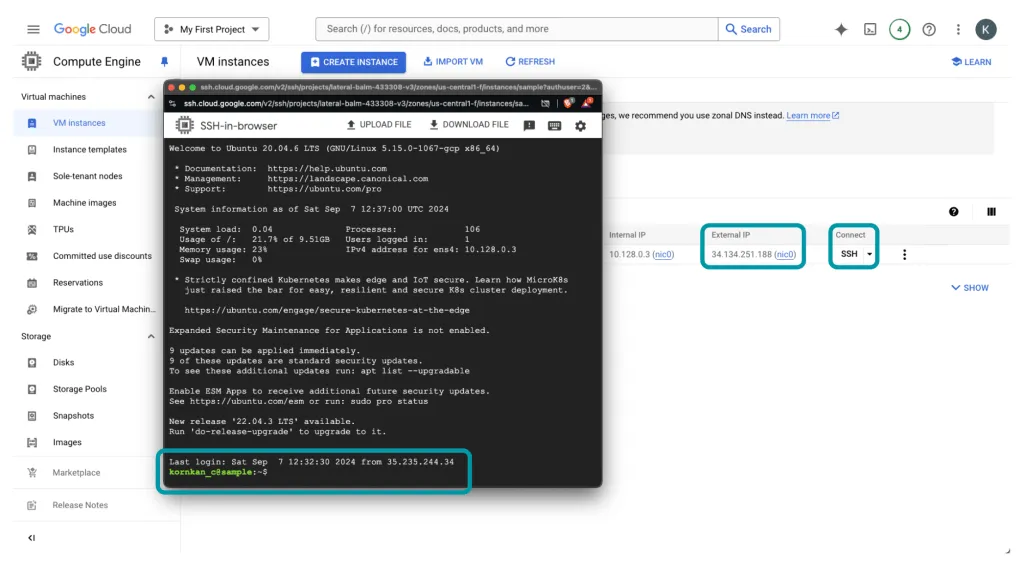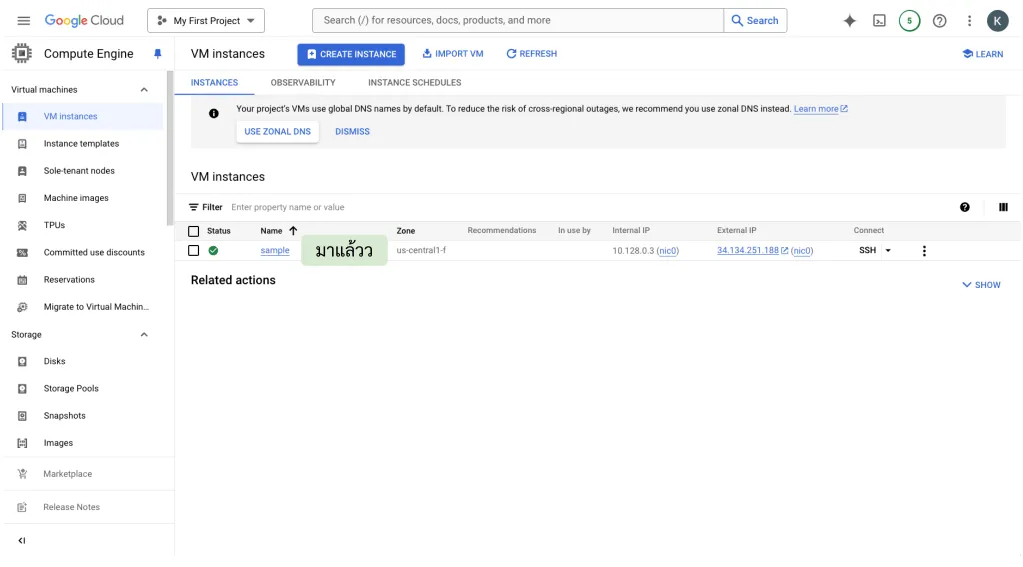 เมื่อเราได้คอมพิวเตอร์หรือที่ใน GCP จะเรียกว่า Instance แล้วให้กดเข้าไปที่ SSH เพื่อเข้าถึง SSH-in-browser ทำให้เราสามารถสั่งการ Instance เครื่องนี้ได้